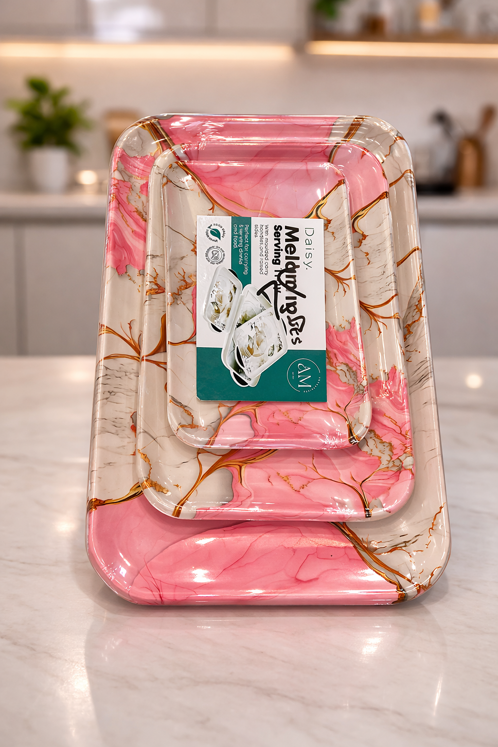 Whether used for hosting guests or daily serving needs, the Daisy melamine tray set combines durability, elegance, and convenience for modern homes.