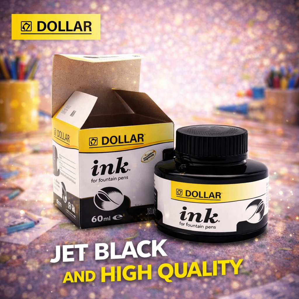 Dollar Fountain Pen Ink is specially formulated to deliver smooth, consistent, and rich writing performance. The deep jet-black color ensures clear, bold text with excellent flow, making it ideal for daily writing, professional use, and calligraphy. Designed for fountain pens, this ink provides reliable performance without clogging and dries evenly on paper. Its high-quality composition makes it suitable for students, professionals, and pen enthusiasts alike.