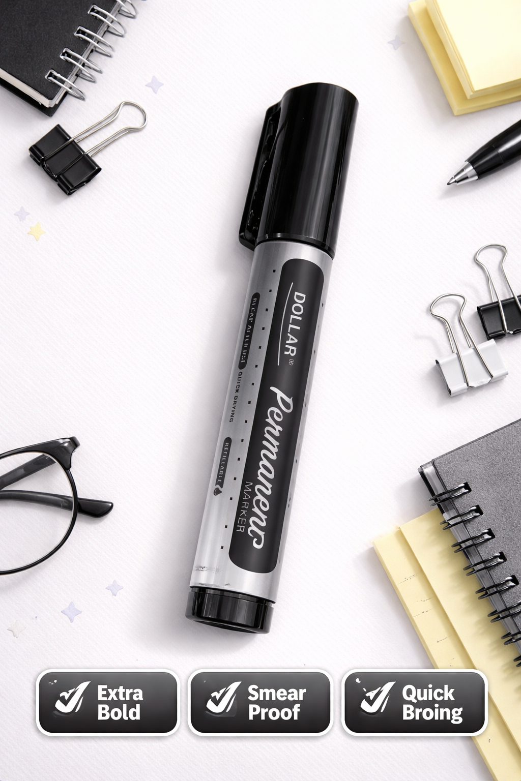The Dollar Permanent Marker Black delivers strong, extra-bold writing with deep black ink that stands out clearly on multiple surfaces. Designed for professional and everyday use, it features quick-drying ink that prevents smudging and ensures clean results.