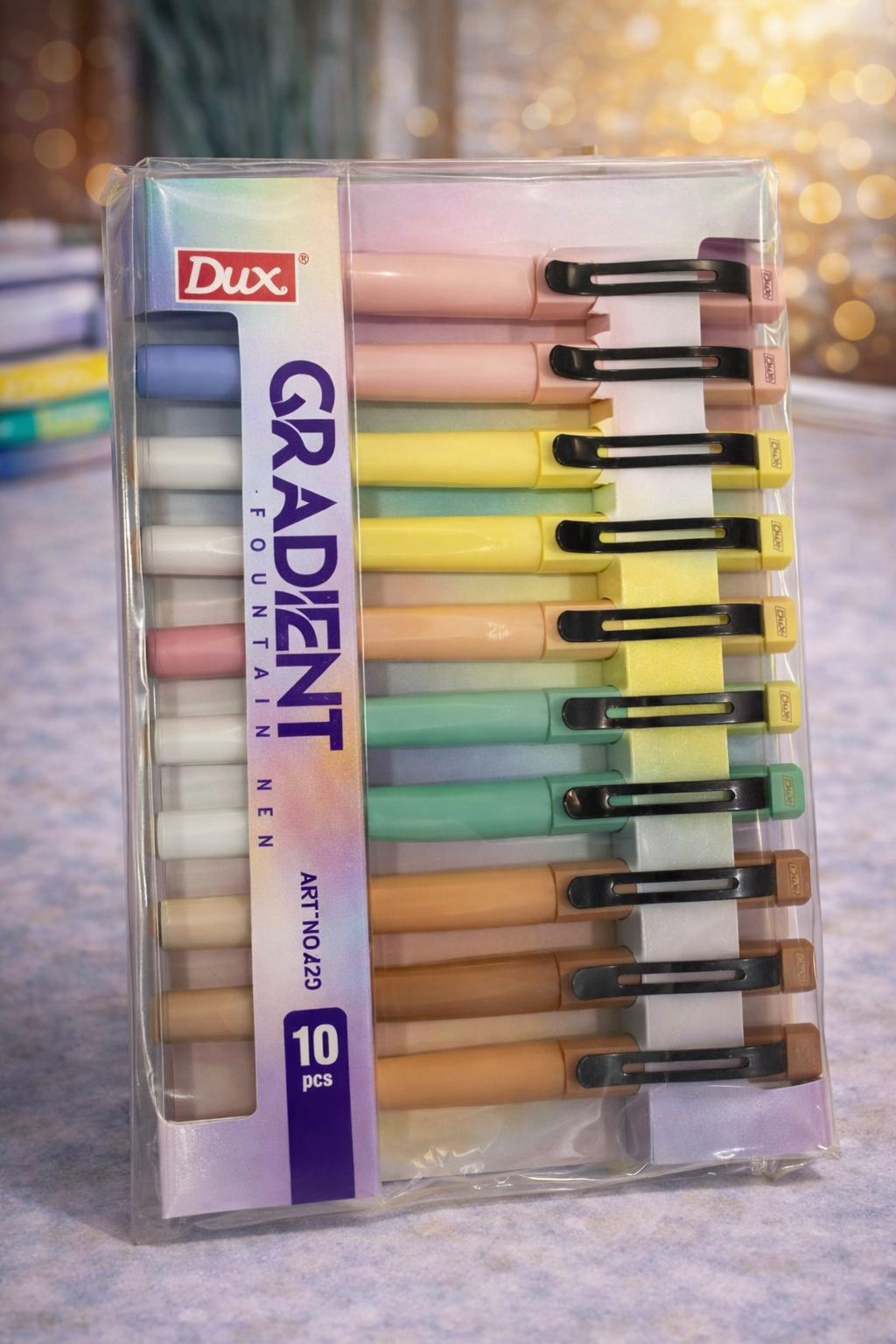 The Dux Gradient Fountain Pen Set includes 10 beautifully designed pastel-gradient pens that combine style with smooth writing performance. Each pen offers consistent ink flow and a comfortable grip, making it ideal for students, journaling, calligraphy practice, and everyday writing. The soft gradient colors add a premium look, while the durable build ensures long-lasting use. Perfect for school, office, or creative writing lovers.