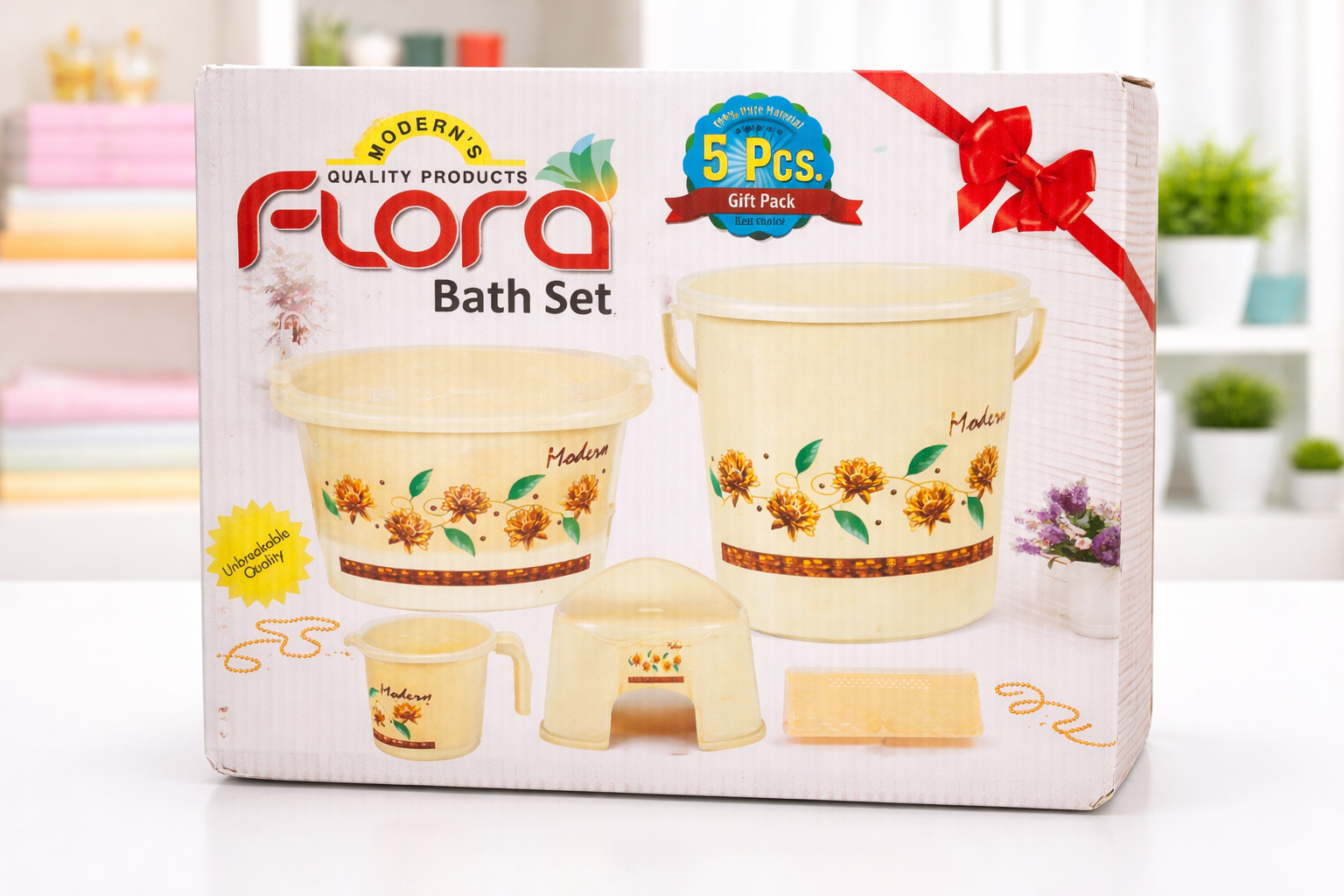 Upgrade your bathroom setup with the Flora 5-Piece Plastic Bath Set – Bathroom Essentials Gift Pack. This beautifully designed set includes all the essential items needed for everyday use, combining practicality with an elegant floral design.