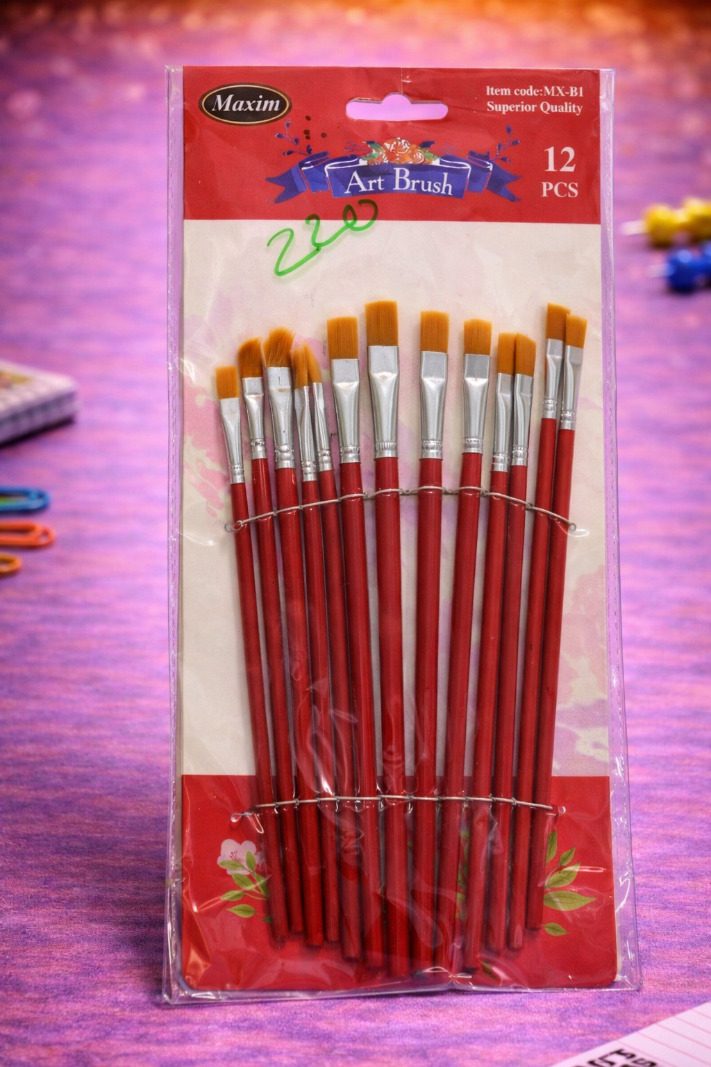 Maxim Art Brush Set is a high-quality collection of 12 professional painting brushes designed for artists, students, and hobbyists. Each brush is crafted with smooth synthetic bristles that hold paint well and deliver clean, precise strokes. The strong wooden handles provide a comfortable grip, making long painting sessions easy and enjoyable.